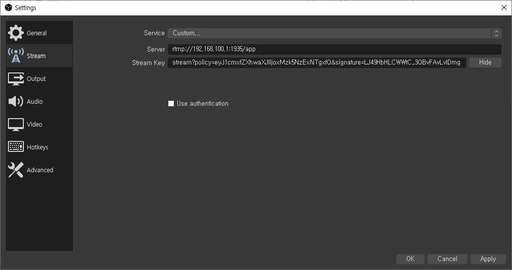 scheme://domain.com:port/app/stream?policy=<>&signature=<>Policy