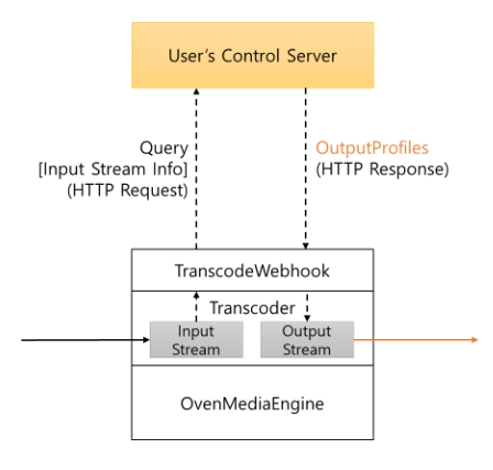 TranscodeWebhook allows OvenMediaEngine to use OutputProfiles from the Control Server's response instead of the OutputProfiles in the local configuration (Server.xml). OvenMediaEngine requests OutputProfiles from the Control Server when streams are created, enabling the specification of different profiles for each individual stream.