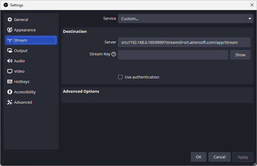 OBS Studio 25.0 or later supports SRT. Please refer to the OBS official documentation for more information. Enter the address of OvenMediaEngine in OBS Studio's Server as follows: When using SRT in OBS, leave the Stream Key blank.