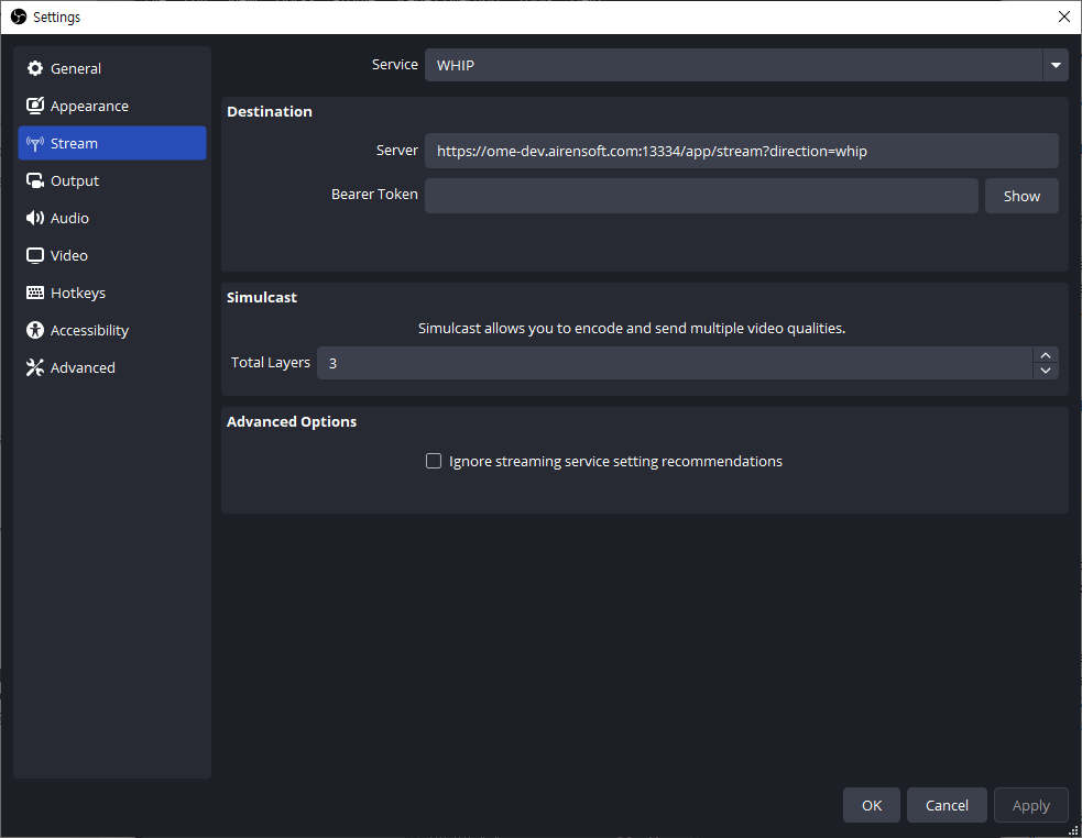 You can test this using an encoder that supports WHIP and simulcast, such as OvenLiveKit or OBS. You can usually set the number of layers as below, and if you use the OvenLiveKit API directly, you can also configure the resolution and bitrate per layer.